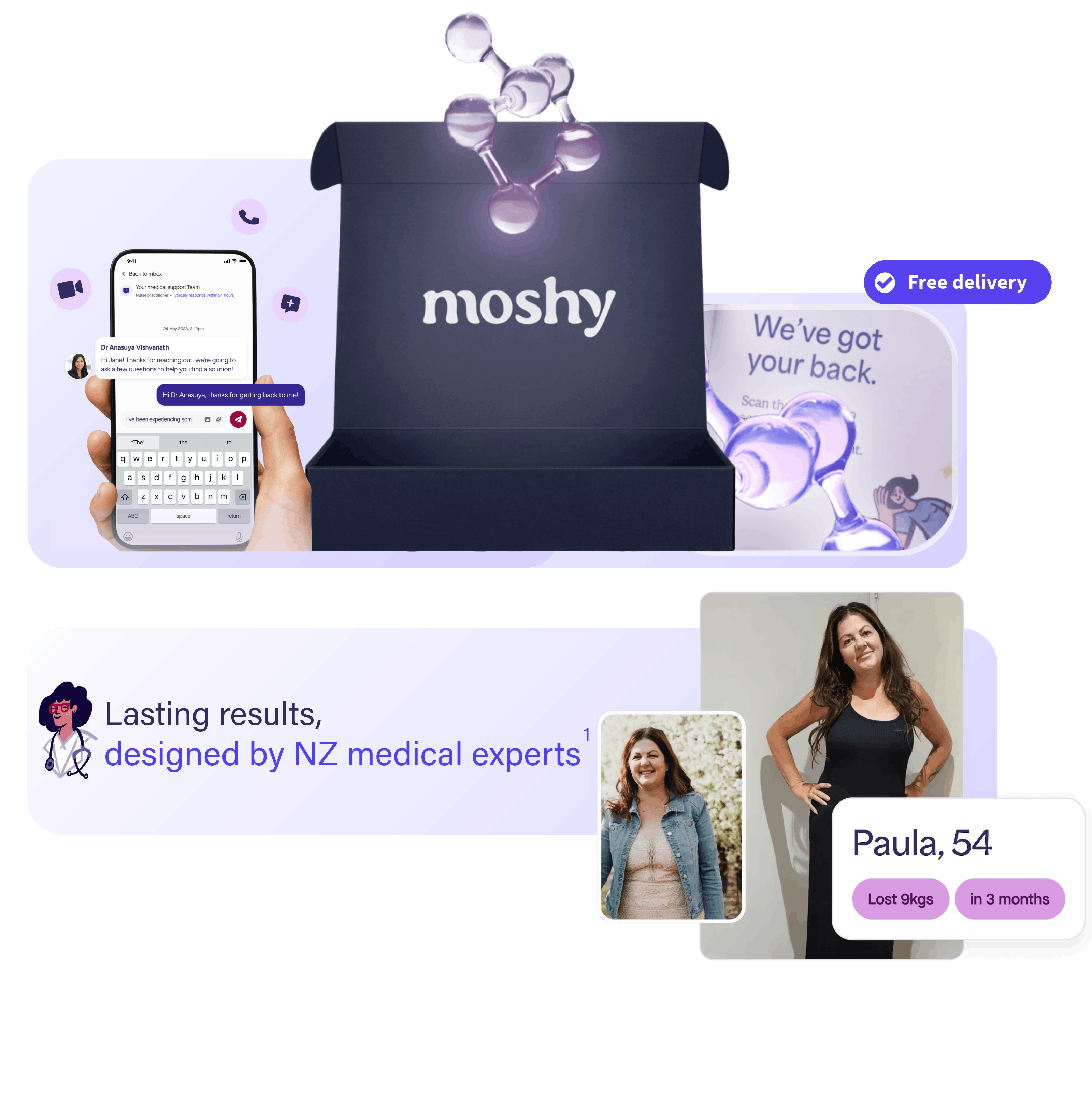 Moshy is an online healthcare service supporting women with medically guided weight loss care. We make it easier to access expert support, wherever you are in New Zealand.